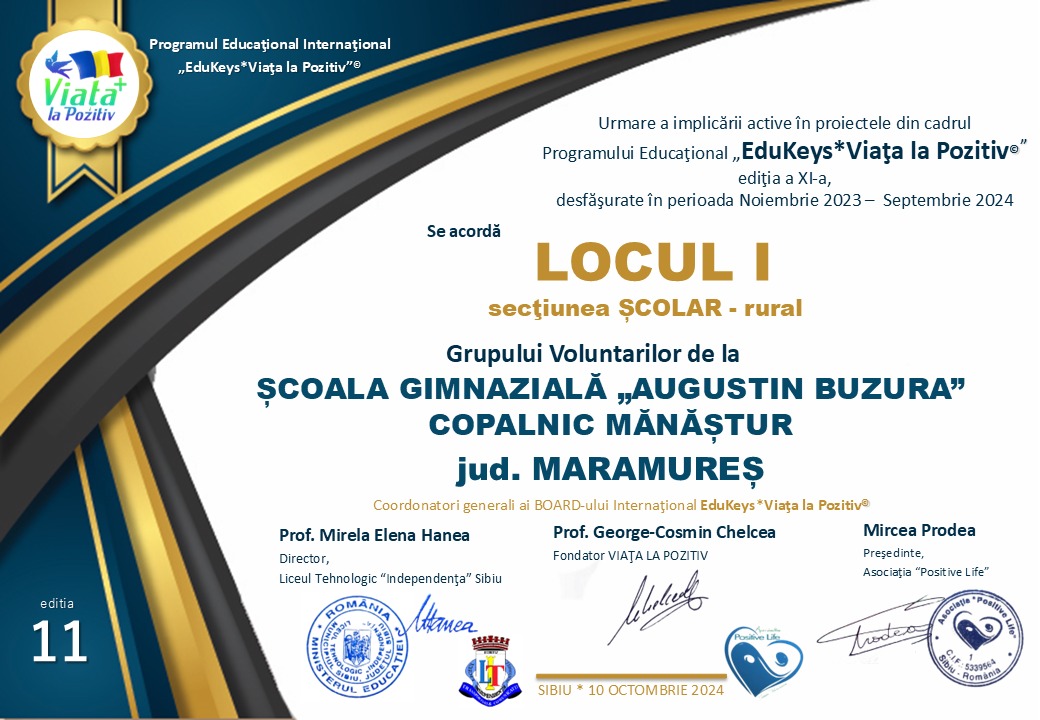 Sub mottoul "Conectăm oameni și idei pentru Educație!", în anul școlar, 2023-2024, Școala Gimnazială "Augustin Buzura" Copalnic Mănăștur a fost parte în Programul Educațional International "EduKeys*Viața la Pozitiv", Ediția a XI-a, inițiat și implementat de Asociația Pozitive Life și Liceu Tehnologic "Tehnologic" Sibiu. În urma evaluării tuturor echipelor participante, grupul voluntarilor școlii noastre au obținut premiul I la secțiunea Școlar – rural.