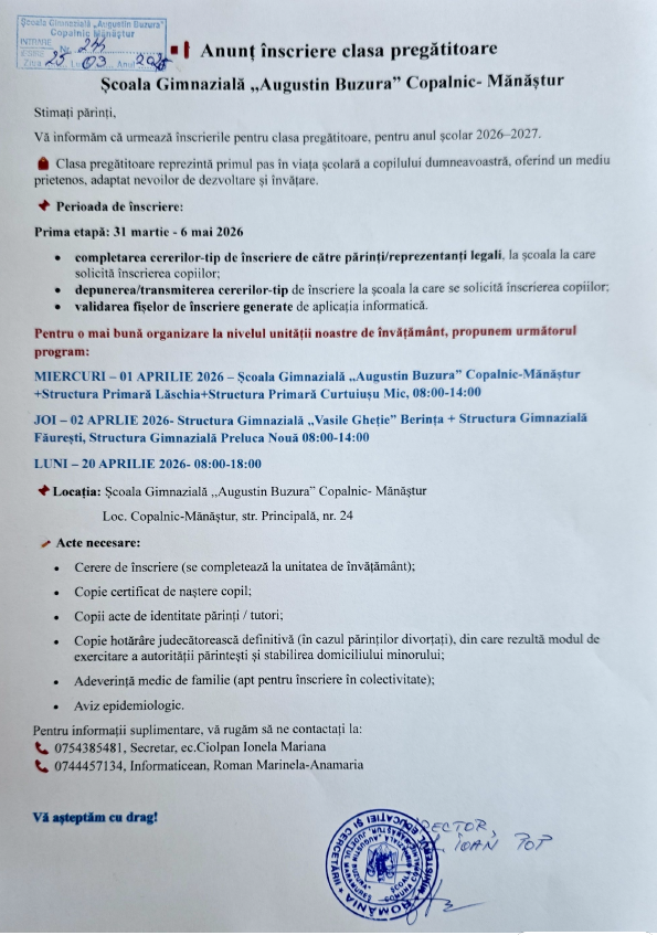 Pentru mai multe informații, vă stăm la dispoziție cu următorul număr de telefon: 0743007067- prof. Gligan Mariana
